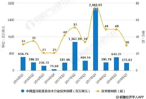 2016-2018Q3年中國清潔能源及技術(shù)行業(yè)投資規(guī)模統(tǒng)計(jì)及增長情況