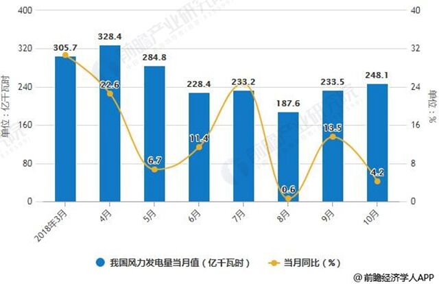 2018年1-10月我國(guó)風(fēng)力發(fā)電量統(tǒng)計(jì)及增長(zhǎng)情況