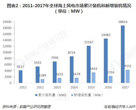 海上風(fēng)電雖然較陸上風(fēng)電起步晚,但是憑借海風(fēng)資源的穩(wěn)定性和大發(fā)電功率的特點,海上風(fēng)電近年來正在世界各地飛速發(fā)展。數(shù)據(jù)顯示,2017年全球海上風(fēng)電吊裝容量恢復(fù)積極良好的發(fā)展勢頭,一掃2016年因英國市場政策改革(RO政策轉(zhuǎn)型為CFD機(jī)制)引起的發(fā)展放緩狀態(tài),全年新增裝機(jī)達(dá)到了4.3GW,實現(xiàn)創(chuàng)紀(jì)錄突破,截至2017年底,全球海上風(fēng)電累計裝機(jī)量18.81GW。
