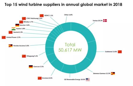 4月17日,全球風(fēng)能理事會(huì)(GWEC)首次發(fā)布《全球風(fēng)電市場(chǎng)-供應(yīng)側(cè)報(bào)告》,該報(bào)告顯示,2018 年全球一共安裝 20,641 臺(tái)風(fēng)機(jī),新增裝機(jī)容量為 50,617 兆瓦。報(bào)告顯示,全球風(fēng)機(jī)制造商前十五中有八家來(lái)自中國(guó)。