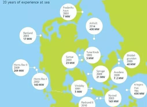 丹麥目前已投運的、建設(shè)中的、已核準的海上風(fēng)電項目包括406.7MW的Horns Rev 3、605MW的Kriegers Flak和Vesterhav Syd、Vesterhav Nord,其中后兩者因為環(huán)評問題而被迫推遲。