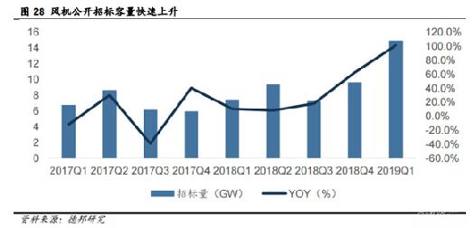 2019開(kāi)年以來(lái),各種題材輪換不止,但是,亦有許多板塊正在“悶聲發(fā)大財(cái)”。這不,到開(kāi)春時(shí)節(jié),風(fēng)電行業(yè)亦是“聞風(fēng)而動(dòng)”,從低谷走出。 風(fēng)電一季度回暖 據(jù)行業(yè)統(tǒng)計(jì),2019年1-3月,全國(guó)新增風(fēng)電裝機(jī)容量478萬(wàn)千瓦,其中海上風(fēng)電12萬(wàn)千瓦,累計(jì)并網(wǎng)裝機(jī)容量達(dá)到1.89億千瓦。2019年1-3月,全國(guó)風(fēng)電發(fā)電量1041億千瓦時(shí),同比增長(zhǎng)6.3%;全國(guó)平均風(fēng)電利用小時(shí)數(shù)556小時(shí),同比下降37小時(shí)。一季度,全國(guó)棄風(fēng)電量43億千瓦時(shí),同比減少48億千瓦時(shí);全國(guó)平均棄風(fēng)率4.0%,棄風(fēng)率同比下降4.5個(gè)百分點(diǎn)。全國(guó)棄風(fēng)電量和棄風(fēng)率持續(xù)“雙降”。 國(guó)內(nèi)風(fēng)電公開(kāi)招標(biāo)容量亦在快速上升。據(jù)金風(fēng)科技的統(tǒng)計(jì),2019年以來(lái),國(guó)內(nèi)公開(kāi)招標(biāo)量已達(dá)到14.9GW,同比增長(zhǎng)101%,創(chuàng)單季最高招標(biāo)量歷史紀(jì)錄。其中,海上風(fēng)電招標(biāo)3.0GW,同比增長(zhǎng)61.2%,占比20.3%。分區(qū)域看,南方市場(chǎng)招標(biāo)3.7GW,占比25.0%,北方項(xiàng)目11.1GW,占比74.3%,集中采購(gòu)招標(biāo)量0.1GW,占比0.7%。