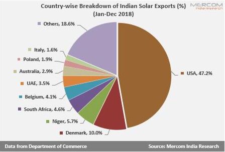 印度太陽能產(chǎn)品出口目的地 因此,印度在太陽能方面報復(fù)升級的范圍有限,因為美國對印度的太陽能出口可以忽略不計,2018年美國出口自印度的太陽能產(chǎn)品不足印度當(dāng)年度進(jìn)口量的1%。但是,那些依賴美國作為不斷增長的出口市場的制造商必須至少在其他地方尋找,直到保障稅率降低為止。