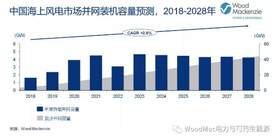 Wood Mackenzie(伍德麥肯茲)電力與可再生能源事業(yè)部近期發(fā)布最新報(bào)告《中國(guó)海上風(fēng)電市場(chǎng)展望2019-2028年》,詳細(xì)解讀未來(lái)十年新增裝機(jī)容量預(yù)測(cè)、政策機(jī)制、分省區(qū)發(fā)展預(yù)測(cè)、平準(zhǔn)化度電成本(LCOE)等內(nèi)容。 2020年將超額實(shí)現(xiàn)海上風(fēng)電裝機(jī)目標(biāo) 預(yù)計(jì)2019-2028年,中國(guó)海上風(fēng)電市場(chǎng)平均每年新增并網(wǎng)裝機(jī)4GW。海上風(fēng)電新增容量占年度新增總量的比重不斷提升,將從2019年的9%增加到2028年的18%。至2028年底,中國(guó)海上風(fēng)電市場(chǎng)累計(jì)并網(wǎng)容量將達(dá)到44GW,占中國(guó)風(fēng)電市場(chǎng)并網(wǎng)總量的10%。 江蘇與廣東將成為主力市場(chǎng),預(yù)計(jì)兩省未來(lái)十年裝機(jī)容量共計(jì)將超過25GW,占全國(guó)新增總?cè)萘康?0%。至2020年,中國(guó)海上風(fēng)電市場(chǎng)累計(jì)并網(wǎng)容量將達(dá)到9.9GW,趕超能源局2020年海上風(fēng)電裝機(jī)目標(biāo)近一倍。