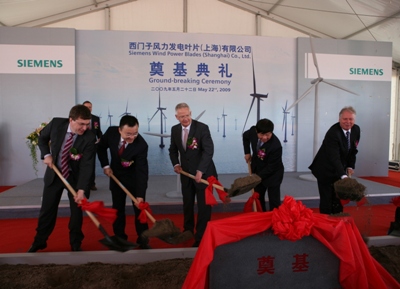 西門子在華首家風(fēng)機(jī)設(shè)備制造廠——西門子風(fēng)力發(fā)電葉片(上海)有限公司今天在上海臨港區(qū)破土動(dòng)工,作為積極拓展其全球風(fēng)機(jī)生產(chǎn)網(wǎng)絡(luò)的重要舉措,此舉標(biāo)志著西門子正式進(jìn)軍中國風(fēng)電市場。西門子風(fēng)力發(fā)電葉片(上海)有限公司的初期投資為5.81億元人民幣(6400萬歐元);工廠計(jì)劃于2010年下半年投入運(yùn)營,屆時(shí)將更好的滿足中國及出口市場對風(fēng)機(jī)設(shè)備的大量需求。上海市副市長艾寶俊、西門子股份公司管理委員會(huì)成員兼能源業(yè)務(wù)領(lǐng)域首席執(zhí)行官戴恩和西門子?xùn)|北亞業(yè)務(wù)區(qū)首席執(zhí)行官、西門子(中國)有限公司總裁兼首席執(zhí)行官郝睿強(qiáng)博士共同為工廠奠基。