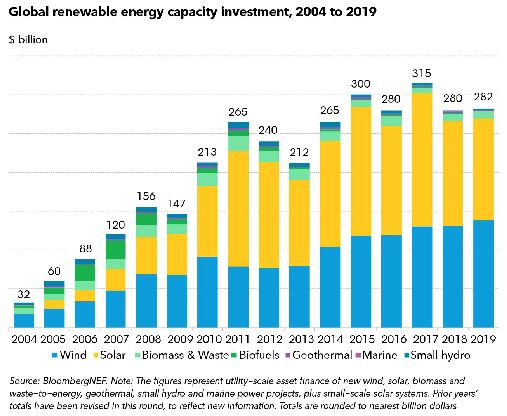 彭博社新能源財(cái)經(jīng)(BNEF)近日發(fā)布的年度數(shù)據(jù)顯示,2019年全球?qū)稍偕茉串a(chǎn)能的投資為2822億美元,較2018年的2802億美元增長1%,全球最大的市場(中國)有所回落,但其第二大市場(美國)創(chuàng)下了新紀(jì)錄。