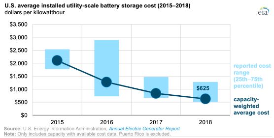 根據(jù)美國能源信息署的數(shù)據(jù),美國公用事業(yè)規(guī)模電池存儲的平均能量容量成本已從2015年的2152美元/千瓦時迅速降至2018年的625美元/千瓦時。截至2018年底,美國的電池裝機功率容量為869兆瓦(電池在給定時刻所能提供的最大功率),電池能量容量為1236兆瓦時(電池可儲能的總能量)。