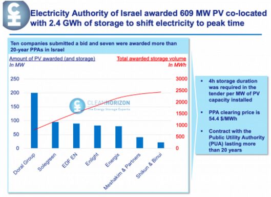 據(jù)外媒報(bào)道,以色列電力管理局(PUA)表示,在日前舉行的一次太陽(yáng)能+儲(chǔ)能項(xiàng)目拍賣(mài)會(huì)上采購(gòu)了總裝機(jī)容量為609MW太陽(yáng)能發(fā)電設(shè)施,而儲(chǔ)能容量為2.4GWh。 招標(biāo)過(guò)程于2020年底結(jié)束,以色列電力管理局(PUA)以0.0544美元/kWh的清算價(jià)格授予并網(wǎng)的太陽(yáng)能發(fā)電設(shè)施和持續(xù)放電時(shí)間為4小時(shí)儲(chǔ)能系統(tǒng)。以色列電力管理局(PUA)總共收到10家公司55個(gè)投標(biāo)書(shū),這些投標(biāo)書(shū)中的太陽(yáng)能發(fā)電設(shè)施裝機(jī)容量總計(jì)為870MW。該機(jī)構(gòu)接受了其中7個(gè)公司33個(gè)投標(biāo)書(shū),這些投標(biāo)書(shū)中的太陽(yáng)能發(fā)電設(shè)施總裝機(jī)容量為608.95MW,儲(chǔ)能系統(tǒng)的總?cè)萘繛?,400MWh以上。