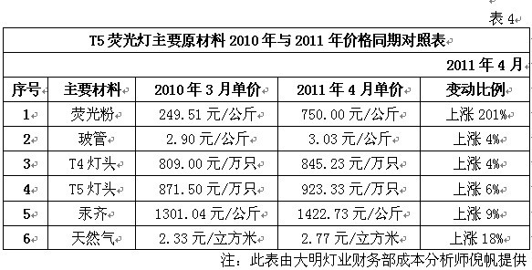 注:此表來源公共機(jī)構(gòu)節(jié)能“十二五”規(guī)劃征求意見稿 我們知道,規(guī)劃中所說的高效節(jié)能熒光燈實(shí)際上指的就是國家財(cái)政補(bǔ)貼推廣的T5熒光燈。有關(guān)方面預(yù)計(jì)此類光源十二五期間將占公共機(jī)構(gòu)單位使用率的50%以上。其它,如緊湊型熒光燈約占25%左右,金鹵燈約占15%左右,LED占約10%左右。 由此可見,在公共機(jī)構(gòu)的表率和示范作用下,在國家財(cái)政補(bǔ)貼推廣舉措的帶動(dòng)下,未來T5熒光燈將成為全社會(huì)照明領(lǐng)域的主體。 因素三.受產(chǎn)業(yè)政策與稀土熒光粉價(jià)格飆升的雙重影響,T8鹵粉熒光燈退出照明行業(yè)的速度將加快 根據(jù)中國照明電器協(xié)會(huì)提供的數(shù)據(jù)表明,目前全球白熾燈、鹵粉熒光燈和三基色節(jié)能熒光燈的應(yīng)用比例為4:3:1,我國約為8:9:1。其中三基色節(jié)能熒光燈是目前應(yīng)用技術(shù)最成熟的環(huán)保節(jié)能照明產(chǎn)品之一,也是當(dāng)前照明領(lǐng)域?qū)嵤┕?jié)能減排,加快淘汰白熾燈和T8低效熒光燈,實(shí)現(xiàn)節(jié)能照明的主要應(yīng)用和推廣對象。大家知道,目前制燈行業(yè)將低氣壓汞蒸汽熒光燈燈管按照熒光粉的成分將其劃分為鹵粉熒光燈、混合粉熒光燈和三基色熒光燈。鹵粉熒光燈的平均壽命在3000-4000小時(shí),混合粉熒光燈的平均壽命在4000-6000小時(shí),而三基色熒光燈的平均壽命最長,在10000小時(shí)以上。 我國是世界照明產(chǎn)品生產(chǎn)第一大國。2009年,我國白熾燈產(chǎn)量為27.3億只,熒光燈產(chǎn)量為35億只。因此,面對巨大的存量市場和增量市場,全球范圍內(nèi)淘汰白熾燈,推廣高效節(jié)能熒光燈的舉措,將帶動(dòng)我國高效節(jié)能熒光燈生產(chǎn)行業(yè)的快速發(fā)展。預(yù)計(jì)到2013年,我國白熾燈的產(chǎn)量將下降至14.2億只,高效節(jié)能熒光燈(主要包括T5雙端三基色熒光燈在內(nèi))的產(chǎn)量將達(dá)到70億只,是目前產(chǎn)量的2.25倍。 同時(shí),早在2008年6月1日,國家發(fā)改委、國家質(zhì)檢總局和國家認(rèn)監(jiān)委組織制定的《中華人民共和國實(shí)行能源效率標(biāo)識的產(chǎn)品目錄(第三批)》開始實(shí)施。其中,熒光燈達(dá)到3級能效以上才可以銷售,達(dá)到2級能效才能獲得節(jié)能認(rèn)證和國家產(chǎn)業(yè)政策支持。國外市場方面,歐盟于2009年9月1日開始執(zhí)行EUP指令。而按照現(xiàn)有鹵粉和混合粉熒光燈的性能指標(biāo)則很難達(dá)到2級能效標(biāo)準(zhǔn)。因此鹵粉熒光燈和混合粉熒光燈將逐步退出照明市場。如此,對我國照明行業(yè)的發(fā)展及其生產(chǎn)企業(yè)的重新定位必將產(chǎn)生極其深遠(yuǎn)的影響。 另外,隨著我國資源戰(zhàn)略產(chǎn)業(yè)結(jié)構(gòu)政策的調(diào)整,稀土原礦等產(chǎn)品被列入加工貿(mào)易禁止類商品目錄。同時(shí)隨著稀土發(fā)光材料市場容量的不斷增加,稀土價(jià)格漲幅明顯加快。目前其價(jià)格與2010年同期相比已飆升至2倍以上,業(yè)內(nèi)人士預(yù)計(jì)未來漲幅還會(huì)增加。表3和表4分別是T5、T8幾何尺寸與熒光粉使用量對照表及T5熒光燈主要原材料2010年與2011年價(jià)格同期對照表。據(jù)此試圖以T8熒光燈采用三基色粉維護(hù)現(xiàn)有產(chǎn)量優(yōu)勢的努力就更是難以實(shí)現(xiàn)了。所以說國家產(chǎn)業(yè)政策和熒光粉價(jià)格的變化將加速T8熒光燈退出照明市場的進(jìn)程。