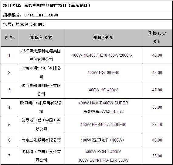 招 標(biāo) 人:財(cái)政部經(jīng)濟(jì)建設(shè)司、國(guó)家發(fā)展和改革委員會(huì)資源節(jié)約和環(huán)境保護(hù)司 招標(biāo)代理機(jī)構(gòu):中國(guó)電子進(jìn)出口總公司 項(xiàng)目名稱:高效照明產(chǎn)品推廣項(xiàng)目(高壓鈉燈) 招標(biāo)編號(hào):0714-EMTC-4094 本項(xiàng)目中標(biāo)入圍結(jié)果公示如下: