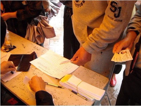 圖為:大明燈業(yè)推廣現(xiàn)場工作前臺社區(qū)居民持身份證踴躍購買大明T5高效照明產(chǎn)品