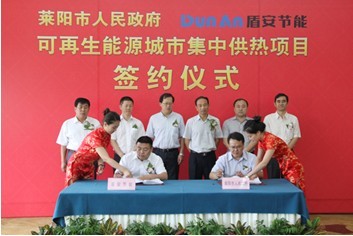 圖為盾安(天津)節(jié)能系統(tǒng)有限公司董事長(zhǎng)付衛(wèi)亮(左)與萊陽市市長(zhǎng)尹鵬簽署可再生能源供熱協(xié)議