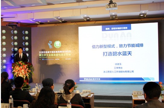 本屆峰會(huì)的主題為“第三次工業(yè)革命重構(gòu)清潔發(fā)展”,從“第三次工業(yè)革命”的背景出發(fā),前瞻國(guó)家政策,分析清潔發(fā)展圖景,交流企業(yè)應(yīng)對(duì)戰(zhàn)略。盾安環(huán)境“環(huán)境優(yōu)化與系統(tǒng)集成”事業(yè)部總經(jīng)理助理徐敬玉在會(huì)上做了《借力新型模式,致力節(jié)能減排,打造碧水藍(lán)天》的主題演講。盾安環(huán)境始終堅(jiān)持“低碳節(jié)能、綠色發(fā)展”的理念,全面實(shí)施產(chǎn)業(yè)轉(zhuǎn)型升級(jí),實(shí)現(xiàn)由傳統(tǒng)產(chǎn)品制造商向系統(tǒng)集成服務(wù)商的華麗轉(zhuǎn)身。2011年在天津設(shè)立盾安節(jié)能產(chǎn)業(yè)總部后,瞄準(zhǔn)工業(yè)余熱、城市污水及可再生能源銳意開(kāi)拓,通過(guò)創(chuàng)新的商業(yè)模式、專業(yè)化的節(jié)能技術(shù)助力城市節(jié)能減排,不僅獲得各地政府與能耗企業(yè)的歡迎與好評(píng),屢獲大單,確立了盾安節(jié)能在節(jié)能服務(wù)行業(yè)的領(lǐng)軍地位,還實(shí)現(xiàn)了工業(yè)企業(yè)、地方政府、社會(huì)大眾與盾安的多方共贏局面。