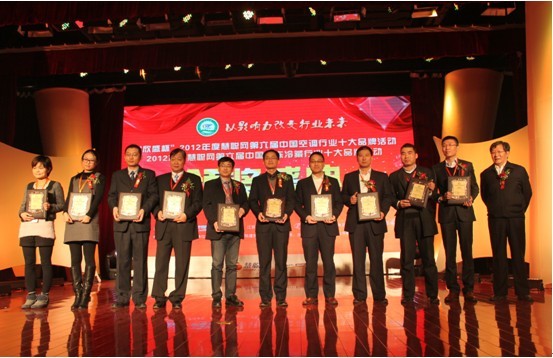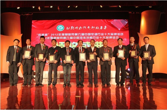 欣盛杯2012年度中國十大中央空調(diào)民族品牌頒獎現(xiàn)場 瀚藝集團(tuán)總裁潘亞平(左五)接受頒獎