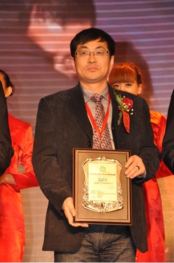 欣盛杯2012年度2012年度中國空調(diào)行業(yè)經(jīng)營成就人物獎--皇冠明珠獎頒獎現(xiàn)場 瀚藝集團(tuán)總裁潘亞平接受頒獎