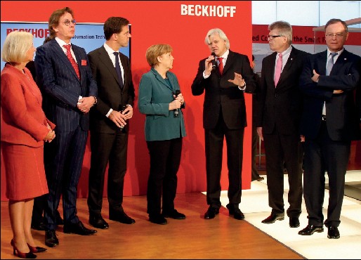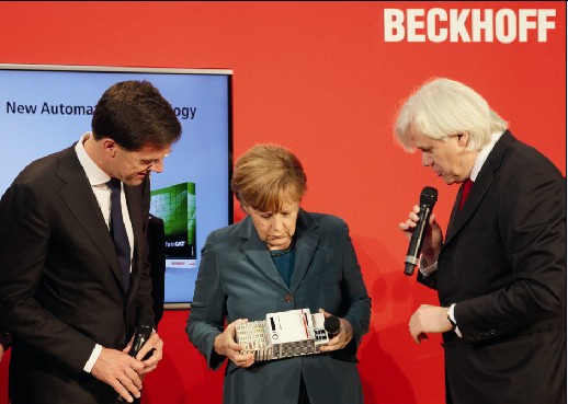 圖片注釋: 在2014 德國漢諾威工業(yè)博覽會上,Hans Beckhoff 先生熱情接待了德國總理安格拉•默克爾和荷蘭首相馬克•呂特,荷蘭是今年漢諾威工業(yè)博覽會的合作伙伴國。