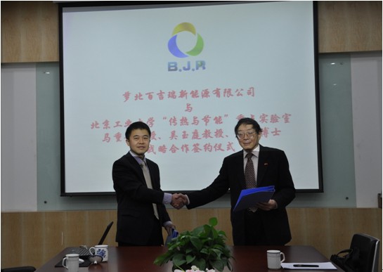 2014年4月11日,蘿北百吉瑞新能源有限公司與北京工業(yè)大學(xué)“傳熱與節(jié)能”重點(diǎn)實(shí)驗(yàn)室主任馬重芳教授團(tuán)隊(duì)關(guān)于共同開(kāi)發(fā)太陽(yáng)能熱電站中熔融鹽的全套蓄熱(儲(chǔ)能)系統(tǒng)產(chǎn)學(xué)研一體化深度戰(zhàn)略合作簽約儀式在北京舉行。 百吉瑞新能源將憑借北工大馬重芳教授研發(fā)團(tuán)隊(duì)的技術(shù)優(yōu)勢(shì),采用馬重芳教授團(tuán)隊(duì)在中高溫熔融鹽傳熱、蓄熱(儲(chǔ)能)領(lǐng)域十多年的研究成果,推出擁有全部國(guó)內(nèi)獨(dú)家自主知識(shí)產(chǎn)權(quán)的熔融鹽配制、融化和蓄熱等系統(tǒng)、設(shè)備及服務(wù),進(jìn)軍國(guó)內(nèi)外巨大的太陽(yáng)能熱發(fā)電市場(chǎng)領(lǐng)域,并以此為契機(jī)加快推動(dòng)中國(guó)熔融鹽蓄熱(儲(chǔ)能)產(chǎn)業(yè)化進(jìn)程。合作雙方百吉瑞董事長(zhǎng)薛凌云、北京工業(yè)大學(xué)馬重芳教授均對(duì)未來(lái)前景充滿信心。業(yè)內(nèi)權(quán)威代表及相關(guān)專(zhuān)家對(duì)雙方合作后的技術(shù)優(yōu)勢(shì)和市場(chǎng)理念給予了高度評(píng)價(jià),并對(duì)其可能對(duì)國(guó)內(nèi)太陽(yáng)能光熱發(fā)電熔鹽蓄熱產(chǎn)業(yè)化進(jìn)程帶來(lái)的推動(dòng)作用寄予厚望。