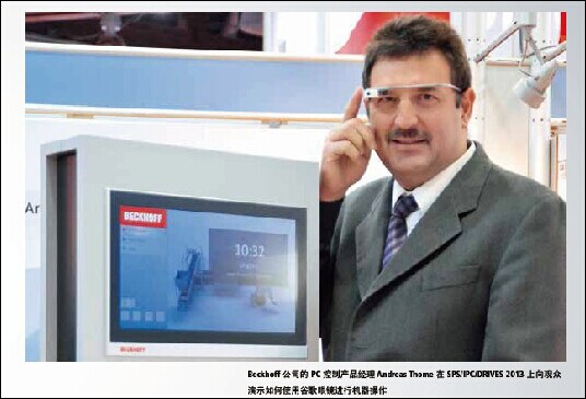 去年在德國紐倫堡舉辦的“2013 年德國紐倫堡工業(yè)自動(dòng)化及元件展覽會(huì)(SPS/IPC/DRIVES 2013)上,Beckhoff 展出了通過專注于谷歌眼鏡的技術(shù)研究開發(fā)而成的針對(duì)機(jī)械操作的最新解決方案。有了具有上網(wǎng)功能的谷歌眼鏡,狀態(tài)或?qū)υ捪⒖梢酝ㄟ^一個(gè)頭戴式顯示器直接投射到人眼中。在線信息和通信也可以用這種創(chuàng)新的設(shè)備實(shí)現(xiàn),且錯(cuò)誤信息可以使用觸摸板進(jìn)行確認(rèn)。Beckhoff 公司的 PC 控制產(chǎn)品經(jīng)理 Andreas Thome 堅(jiān)定地認(rèn)為,谷歌眼鏡是互聯(lián)網(wǎng)和自動(dòng)化技術(shù)相融合推動(dòng)工業(yè) 4.0 發(fā)展的最突出的例子。 Beckhoff 公司的 PC 控制產(chǎn)品經(jīng)理 Andreas Thome 在 SPS/IPC/DRIVES 2013 上向觀眾演示如何使用谷歌眼鏡進(jìn)行機(jī)器操作。 是什么讓谷歌的這些“增強(qiáng)現(xiàn)實(shí)眼鏡”從競爭中脫穎而出,用作工業(yè)環(huán)境中的控制元件? Andreas Thome:谷歌眼鏡配置包括頭戴式顯示器、攝像頭、麥克風(fēng)和用作揚(yáng)聲器的骨傳導(dǎo)耳機(jī) — 它還配備了振動(dòng)傳感器并在耳機(jī)側(cè)面集成了一個(gè)觸摸板。有了這些功能,谷歌眼鏡非常適合用于可視化、診斷和服務(wù),以及技術(shù)干預(yù)和個(gè)人通信。不同于傳統(tǒng)的控制理念,該設(shè)備屬于被稱為“可穿戴計(jì)算”的創(chuàng)新技術(shù) — 一組每天可以通過用戶佩戴來大幅提高其連通性的設(shè)備。事實(shí)上,很多這些設(shè)備現(xiàn)在都已經(jīng)具有現(xiàn)代智能手機(jī)所具備的所有功能。更重要的是,谷歌眼鏡型設(shè)備使用起來都很方便,因?yàn)槠浒胪该髡陉柊宸先梭w工學(xué),且主要都是免提操作。最大的優(yōu)點(diǎn)在于 — 也著眼于工業(yè)自動(dòng)化 — 現(xiàn)有的移動(dòng)計(jì)算技術(shù)可以在我們的感官知覺或我們的肢體動(dòng)作沒有任何限制的情況下使用 — 而且無需電線或電纜。 如何將谷歌眼鏡與 PC 控制整合在一起? Andreas Thome:使用 Beckhoff 的 TwinCAT 自動(dòng)化軟件可以將谷歌眼鏡與控制技術(shù)輕松集成在一起。眼鏡與萬維網(wǎng)服務(wù)器通訊,該服務(wù)器提供了通過 TwinCAT 控制的機(jī)器狀態(tài)信息。眼鏡接收此狀態(tài)信息并以信號(hào)或錯(cuò)誤消息的形式表現(xiàn)出來,甚至還可以指出任何問題的確切位置。確認(rèn)和復(fù)位機(jī)器狀態(tài)等工作也可在現(xiàn)場通過谷歌眼鏡完成。 在哪些情況下可以使用此方案? Andreas Thome:潛在的應(yīng)用場景可以被歸類為“直接或間接”。例如,操作人員可以使用眼鏡“直接”監(jiān)控機(jī)器或甚至采取行動(dòng)來直接改變或更正機(jī)器狀態(tài),而不總是需要在現(xiàn)場完成。對(duì)于大型機(jī)器和生產(chǎn)設(shè)備,操作人員需要在設(shè)備周圍走動(dòng)并檢查特定臨界點(diǎn)的工藝狀態(tài)值,同時(shí)查看設(shè)備是運(yùn)作情況。必要時(shí),操作人員可以采取手動(dòng)操作,因?yàn)殡p手都是自由的!伴g接”選項(xiàng)涉及到信息的收集和保存,不完全依賴于正在運(yùn)行的進(jìn)程。這些選項(xiàng)包括,例如,研究制造商有關(guān)特定機(jī)器組件的文檔資料,在 Internet 上搜索信息,并通過電子郵件和支持視頻聊天的聊天工具進(jìn)行人際互動(dòng)。然而,直接和間接應(yīng)用的組合也是可能的。即使一臺(tái)機(jī)器正在運(yùn)行,操作人員也可以與專家聯(lián)系并通過眼鏡將正在運(yùn)轉(zhuǎn)的機(jī)器的視頻發(fā)送給專家,以咨詢一些具體的問題。隨后,專家可以給現(xiàn)場操作人員提供技術(shù)支持 — 以視頻或語音消息的形式 — 這樣就可以采取相應(yīng)的糾正措施。這是被描述為“你看到的就是我看到的”(WYSIWIS)的 IT 概念也可以在工業(yè)環(huán)境下應(yīng)用的范例。 靜態(tài)和動(dòng)態(tài)的機(jī)器狀態(tài)信息可以被投射到谷歌眼鏡的頭戴式顯示器上。 如果出現(xiàn)錯(cuò)誤,谷歌眼鏡會(huì)輕輕振動(dòng),提醒操作人員注意出錯(cuò)消息。一旦錯(cuò)誤被糾正,該消息可以直接通過增強(qiáng)現(xiàn)實(shí)眼鏡復(fù)位。 有關(guān)在日常生活中使用這種新的控制技術(shù)有什么新的想法嗎? Andreas Thome:有許多不同的方法來實(shí)現(xiàn)。例如,維修工程師可以使用集成的攝像頭捕捉到電機(jī)或限位開關(guān)的 QR 碼,然后檢索有關(guān)其功能、歷史狀態(tài)或當(dāng)前狀態(tài)的信息。另一個(gè)辦法是瀏覽包含機(jī)器控制軟件相關(guān)信息的網(wǎng)站 — 大小為 640×360 像素的分辨率,無需使用鼠標(biāo) — 這將是可行的,如果原始資料被格式化為與增強(qiáng)現(xiàn)實(shí)眼鏡同時(shí)使用。操作人員可以查找由制造商定義的計(jì)算機(jī)設(shè)置,然后采取適當(dāng)?shù)男袆?dòng)。也可以編寫在谷歌眼鏡上本地運(yùn)行的特殊應(yīng)用程序,并能夠通過 WLAN 使用如 OPC UA 或 TwinCAT ADS 等協(xié)議建立與機(jī)器控制計(jì)算機(jī)的連接。作為谷歌眼鏡技術(shù)研究的一部分,Beckhoff 提供二進(jìn)制和模擬變量的實(shí)時(shí)可視化應(yīng)用程序作為本地程序。在所有這些情況下,可以顯示狀態(tài)數(shù)據(jù)(變量,誤差)。此外,操作人員可以使用谷歌眼鏡來修改設