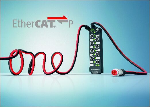 圖片注釋: 針對現(xiàn)場級的單電纜解決方案 — EtherCAT P將 EtherCAT 通訊以及系統(tǒng)和外圍電壓集成在一根電纜中。 。