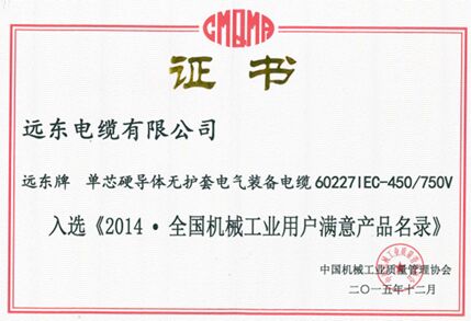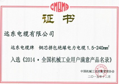 本次評價活動以產(chǎn)品可靠性為核心,以用戶直接感知的質(zhì)量和服務(wù)為內(nèi)容,以行業(yè)地位、質(zhì)檢結(jié)論為依據(jù),以客觀公正為原則,由中國機械工業(yè)質(zhì)量管理協(xié)會組織全國性行業(yè)協(xié)會(專業(yè)協(xié)會)、行業(yè)綜合排名前5位的龍頭企業(yè)、各省市行業(yè)主管部門進行評價推薦,并采用評價表的方式對產(chǎn)品的各項關(guān)鍵指標(biāo)進行定性、定量評價,共篩選產(chǎn)生113項產(chǎn)品入選《2014.全國機械工業(yè)用戶滿意產(chǎn)品名錄(零部件)》。 長期以來,遠東電纜始終堅持以質(zhì)取勝,以過硬的品質(zhì)服務(wù)社會。把質(zhì)量工作放在首位,采用先進的質(zhì)量管理方法,提升全面質(zhì)量管理水平,并在質(zhì)量管理方法及技術(shù)方面不斷創(chuàng)新。中國機械工業(yè)質(zhì)量管理協(xié)會授予這一榮譽正是對遠東電纜在質(zhì)量工作方面取得成績的認可,更是對其創(chuàng)新、創(chuàng)優(yōu)精神和技術(shù)實力的充分肯定。