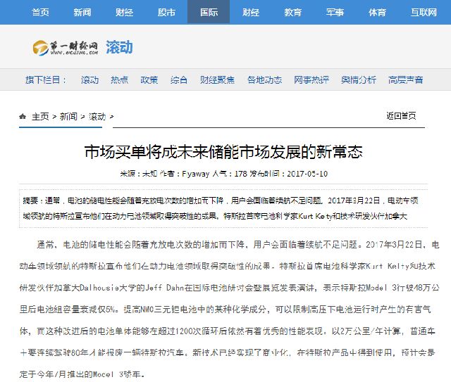 通常,電池的儲(chǔ)電性能會(huì)隨著充放電次數(shù)的增加而下降,用戶會(huì)面臨著續(xù)航不足問題。2017年3月22日,電動(dòng)車領(lǐng)域領(lǐng)航的特斯拉宣布他們?cè)趧?dòng)力電池領(lǐng)域取得突破性的成果。特斯拉首席電池科學(xué)家Kurt Kelty和技術(shù)研發(fā)伙伴加拿大Dalhousie大學(xué)的Jeff Dahn在國際電池研討會(huì)暨展覽發(fā)表演講,表示特斯拉Model 3行駛48萬公里后電池組容量衰減僅5%。提高NMC三元鋰電池中的某種化學(xué)成分,可以限制高壓下電池運(yùn)行時(shí)產(chǎn)生的有害氣體,而這種改進(jìn)后的電池單體能夠在超過1200次循環(huán)后依然有著優(yōu)秀的性能表現(xiàn)。以2萬公里/年計(jì)算,普通車主要連續(xù)駕駛80年才能報(bào)廢一輛特斯拉汽車。新技術(shù)已經(jīng)實(shí)現(xiàn)了商業(yè)化,在特斯拉產(chǎn)品中得到使用,預(yù)計(jì)會(huì)是定于今年7月推出的Model 3轎車。 對(duì)于所有電池行業(yè)的人來說,這確是一個(gè)值得振奮的消息。燃油車與電動(dòng)車相比,哪個(gè)更有未來不言而喻。超長續(xù)航能力以及能量衰減的電池問題得以解決,電動(dòng)汽車的市場(chǎng)容量只是時(shí)間問題。 電動(dòng)汽車的生產(chǎn)應(yīng)用市場(chǎng)是儲(chǔ)能產(chǎn)業(yè)成功商業(yè)化,取得迅速發(fā)展的表現(xiàn)之一。據(jù)不完全統(tǒng)計(jì),2015年中國低速電動(dòng)汽車產(chǎn)銷量約70萬輛,2016年達(dá)到了120萬輛。從電動(dòng)汽車的發(fā)展路線和電池技術(shù)水平來看,低速電動(dòng)車將是最近十年中國電動(dòng)汽車發(fā)展的市場(chǎng)主流,也是未來十年后新能源汽車產(chǎn)業(yè)的重要補(bǔ)充。 電池領(lǐng)域的技術(shù)性革新也向儲(chǔ)能產(chǎn)業(yè)展示了種種可能。去年,華為中央研究院瓦特實(shí)驗(yàn)室在第57屆日本電池大會(huì)上宣布在鋰離子電池領(lǐng)域?qū)崿F(xiàn)重大研究突破,推出業(yè)界首個(gè)高溫長壽命石墨烯基鋰離子電池。實(shí)驗(yàn)結(jié)果顯示,以石墨烯為基礎(chǔ)的新型耐高溫技術(shù)可以將鋰離子電池上限使用溫度提高10℃,使用壽命是普通鋰離子電池的2倍。據(jù)國家統(tǒng)計(jì)局日前公布數(shù)據(jù),2017年1-2月份,中國鋰離子電池累計(jì)產(chǎn)量為114485萬只,平均單月產(chǎn)量為57242萬只。
