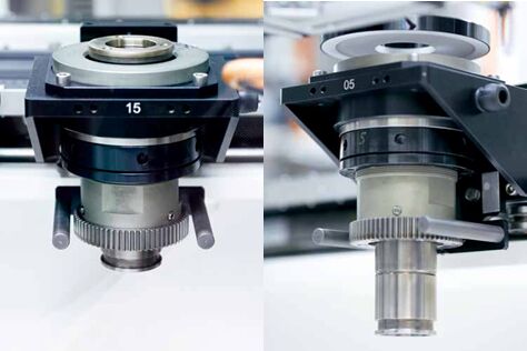 帶有上下芯棒(左圖和右圖)的 XTS 動子沿著“帽形”或“杯形”方向拾取擴散器。還可以看到的是用于在線掃描相機前面旋轉(zhuǎn)部件的鏈輪 緊跟旋轉(zhuǎn)工位后面的是用于檢測材料偏差情況的控制工位和用于檢查擴散器底部的工位。第一個 XTS 直線段的最后一個相機工位負責(zé)檢查法蘭是否有質(zhì)量缺陷。這意味著第一個直線段控制六個相機工位。加上完全一樣的線掃描和旋轉(zhuǎn)工位,總共有九個工位。