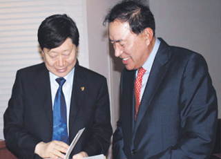 圖片說明:交流結(jié)束后,海爾集團(tuán)首席執(zhí)行官張瑞敏向李潤雨先生(右)贈送《海爾員工畫與話》,李潤雨先生特意請張瑞敏在書上簽字留念。