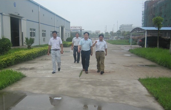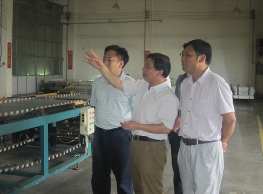 圖為松滋市發(fā)改局局長羅明雄(右二)、副局長張磊(左二)、李主任在營銷總監(jiān)文純陽的陪同下參觀大明燈業(yè)生產(chǎn)基地。